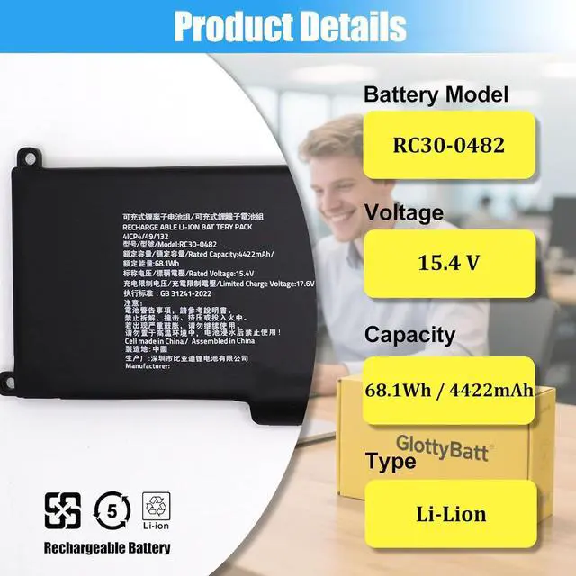 BATTERY SPECIFICATION: Model Name: RC30-0482; Voltage: 15.4V; Capacity: 68.1Wh 4422mAh; Battery Type: Li-ion; Condition: 100% brand new from manufacturer; Package include: 1*battery + battery installation screwdrivers + 1*instruction for laptop battery