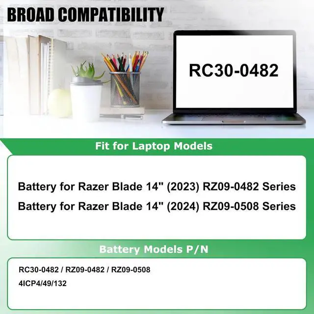 COMPATIBLE LAPTOP MODELS: Battery replacement for Razer Blade 14 inch 2023 RZ09-0482 RZ09-0482VEH3-R3E1 RZ09-0482VWH3-R3W1 RZ09-0482VGH3-R3G1, for Razer Blade 14 inch 2024 RZ09-0508 RZ09-0508VED3-R3E1 RZ09-0508VWD3-R3W1 RZ09-05081GM3-R3G1 RZ09-050811M3-R311 Series