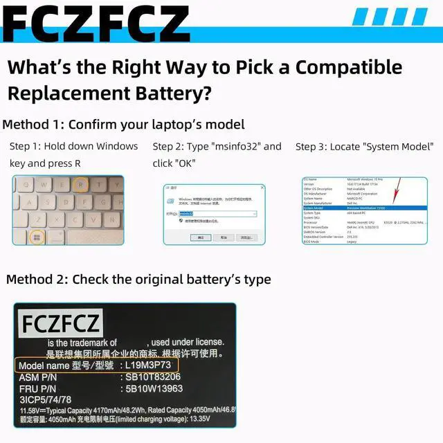 InstructionsPlease open the back cover of the laptop before purchasing and confirm that the original battery type is the same as the picture. Please read the battery instruction manual carefully before installing the battery. Please install the battery correctly and ensure that the battery interface and the motherboard are firmly connected. Please use the original charger to charge the laptop. After battery installation, discharge the new battery to 5% (not 0%), then charge and cycle 3-4 times to wake up the new battery.