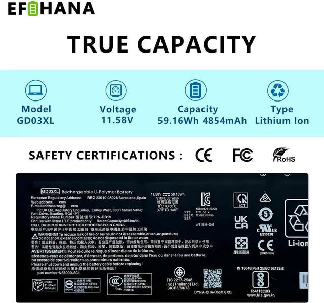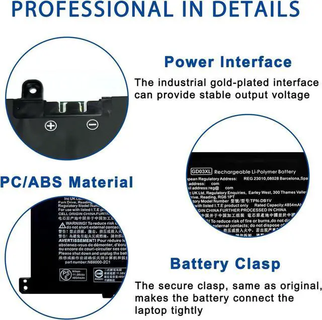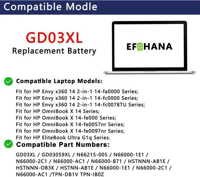 Compatible Part NumberGD03XL GD03059XL N66215-005 N66000-1E1 N66000-2C1 N66000-AC1 N66000-B71 HSTNNN-AB1E HSTNNN-OB3K HSTNN-AB1E N66000-1E1 N66000-2C1 N66000-AC1 TPN-DB1V TPN-IB0Z