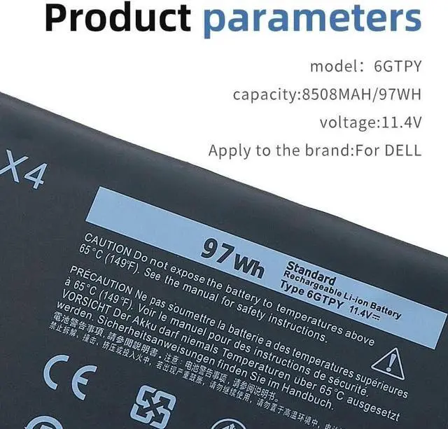 Specifications: Mercobat 97Wh 6GTPY Battery Compatible with Dell 97Wh Battery Type 6GTPY 11.4V.Cells:6 cells.Color: Black.Condition: Brand new