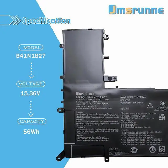 Asus B41N1827 battery Specifications Model: B41N1827 . Voltage: 15.36V . Capacity:56Wh/3550mAh. Condition: 100% brand New from Manufacturer. Battery type: Li-ion. /Battery life: Up to 1000 recharge cycles over the life of the battery. Also comes with installation tools.Purchasing Note: Due to the complexity of laptop battery models, you may not be able to accurately determine the model you need to purchase,Please open the back cover of the laptop to confirm the original battery model number