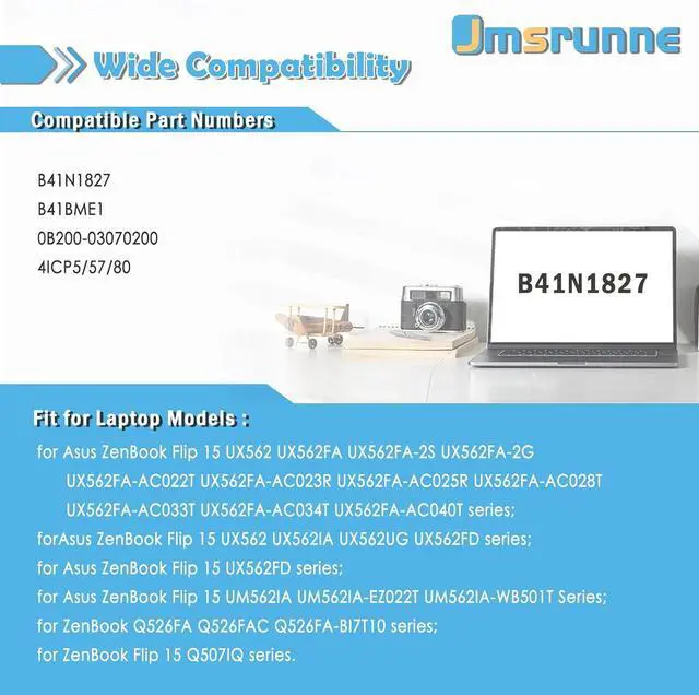 B41N1827 56Wh battery Compatible laptop Modelsfor Asus ZenBook Flip 15 UX562 UX562FA UX562FA-2S UX562FA-2G UX562FA-AC022T UX562FA-AC023R UX562FA-AC025R UX562FA-AC028T UX562FA-AC033T UX562FA-AC034T UX562FA-AC040T series;forAsus ZenBook Flip 15 UX562 UX562IA UX562UG UX562FD series; for Asus ZenBook Flip 15 UX562FD series; for Asus ZenBook Flip 15 UM562IA UM562IA-EZ022T UM562IA-WB501T Series; for ZenBook Q526FA Q526FAC Q526FA-BI7T10 series; for ZenBook Flip 15 Q507IQ series.