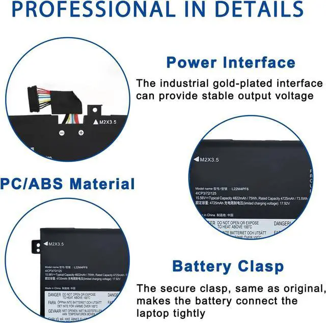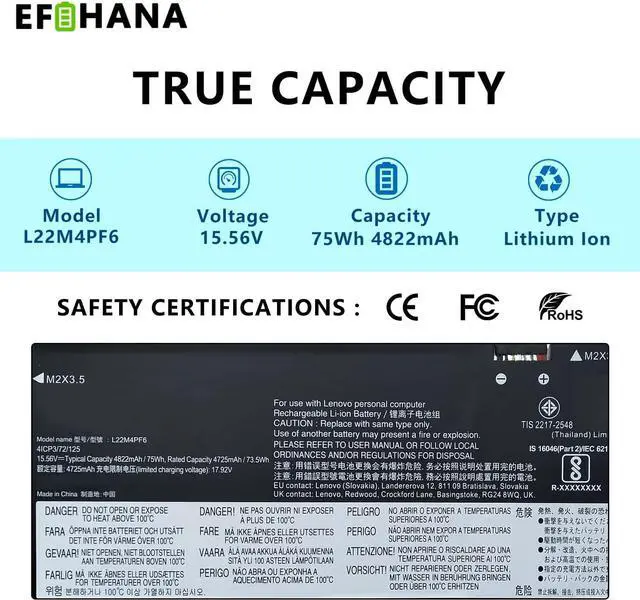 SpecificationsModel:L22M4PF6 // Battery type: Li-ion // Voltage: 15.56V// Capacity: 75Wh/4822mAh // 100% New from Manufacturer. Top circuit boards and smart chip.