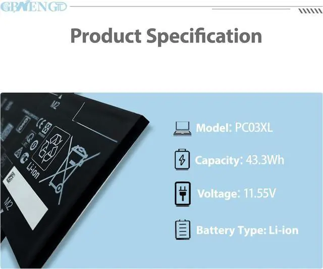 Specifications Model:PC03XL Capatity: 43.3Wh Voltage:11.55V Color: Black Battery type: Rechargeable Li-ion Battery Condition: 100% brand New from Manufacturer.