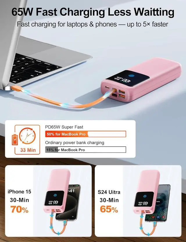 + Equipped with high-density lithium-polymer battery and 65W PD protocol, this portable charger charges iPhone 15 up to 5 charges, MacBook Pro 1.8 charges, and as a power bank fast charging solution, hits 50% of your laptop power bank's battery in 33 mins, ideal for tripseliminating battery anxiety