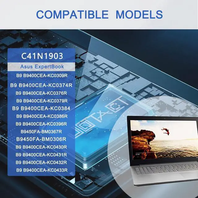 Compatible with Laptop ModelsFor Asus ExpertBook B9 B9400CEA-KC0309R; ExpertBook B9 B9400CEA-KC0374R; ExpertBook B9 B9400CEA-KC0376R; ExpertBook B9 B9400CEA-KC0379R; ExpertBook B9 B9400CEA-KC0384; ExpertBook B9 B9400CEA-KC0386R; ExpertBook B9 B9400CEA-KC0396R; ExpertBook B9 B9400CEA-KC0430R; ExpertBook B9 B9400CEA-KC0431R; ExpertBook B9 B9400CEA-KC0432R; ExpertBook B9 B9400CEA-KC0433R B9450FA-BM0306R, B9450FA-BM0367R, B9450FA-BM0370R, B9450FA-XS79; ExpertBook B B9400CEA-KC0336R and more