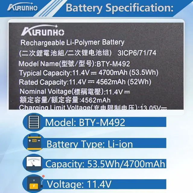 Specifications Model: BTY-M492 . Voltage: 11.4V . Capacity: 53.3Wh/4700 . Color: Black . 100% brand New from Manufacturer.