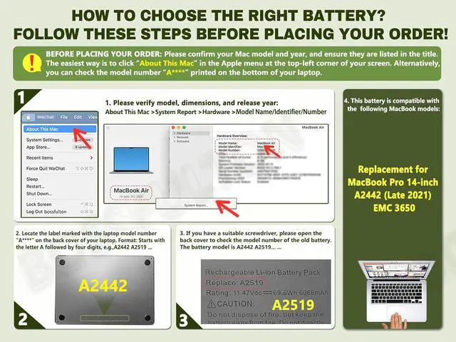 Compatible A2442 Laptop ModelsA2442 Battery Replacement for MacBook Pro 14-inch A2442 (2021) ,Replacement for Macbook pro A2442 A2779 A2918 battery replacement. EMC Applicable number: 3650/8102/8304