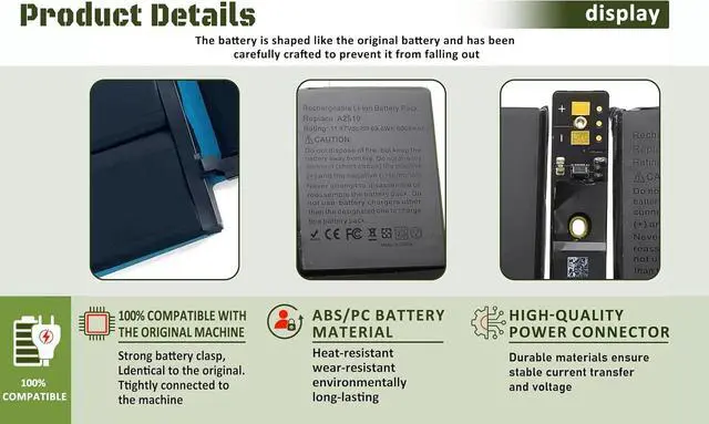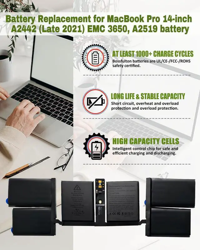 Premium A2519 Battery SpecificationsBattery Model: A2519 , Laptop Model: A2442 Capacity: 6100mAh/69.9Wh , Voltage: 11.47V. Battery Type: Li-Polymer; 100% brand new from manufacture.100% compatibility with the original A2442 batteries for MacBook Pro 14" A2442 (2021), EMC 3650/8102