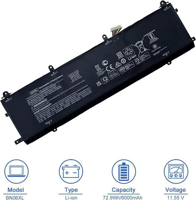 SpecificationsBattery Model :BN06XL for hp spectre x360 battery; Product Type: Replacement battery; Battery Type: Li-ion; Voltage: 11.55 V; Capacity: 72.9Wh/6000mAh; Battery Life: Up to 500 cycling from grade A cells in JOTACT batteries.