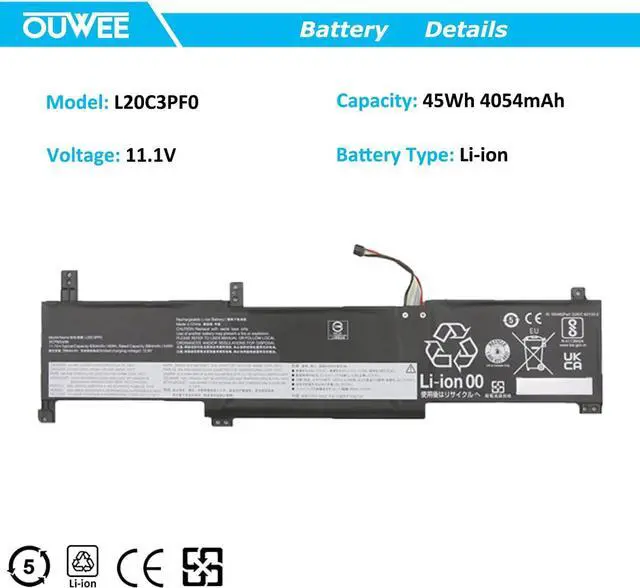 Specifications L20C3PF0 battery for Lenovo IdeaPad Replacement Battery, Type: Li-ion; Our L20C3PF0 Battery Replacement for Lenovo 45wh Standard L20C3PF0 Rechargeable li-ion battery.Voltage: 11.1V; Capacity: 45Wh 4054mAh; Color: Black;Condition: New;
