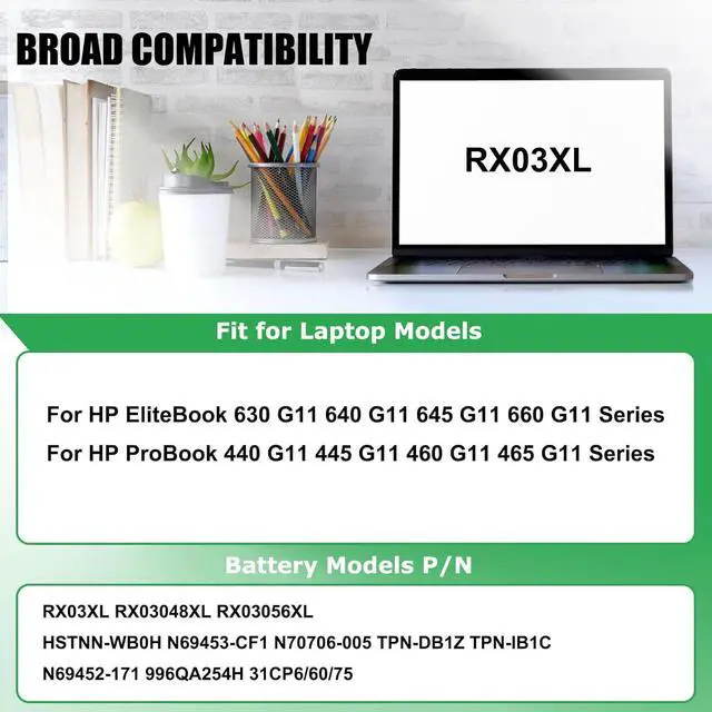 COMPATIBLE PART NUMBER: Battery RX03XL RX03048XL RX03056XL HSTNN-WB0H N69453-CF1 N70706-005 TPN-DB1Z TPN-IB1C N69452-171 996QA254H 31CP6/60/75