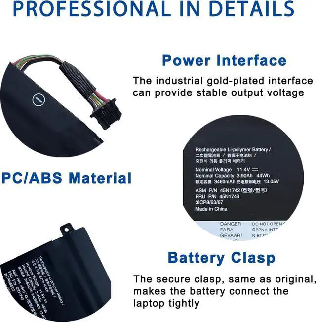 [Specifications] Model: 45N1742 // Battery type: Li-ion // Voltage: 11.4V // Capacity: 44Wh/3900mAh // 100% New from Manufacturer. Top circuit boards and smart chip