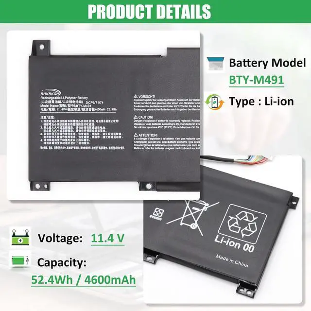 BATTERY SPECIFICATION: Model Name: BTY-M491; Voltage: 11.4V; Capacity: 52.4Wh / 4600mAh; Battery Type: Li-ion; Condition: 100% brand new from manufacturer; Color: Black; Packaged come with: 1*battery + battery installation screwdrivers + 1*instruction for laptop battery