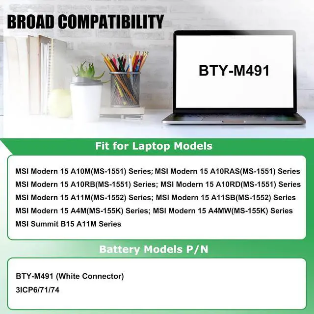COMPATIBLE LAPTOP MODELS: Fit for Msi Modern 15 A10RB Series: A10RB-041TW; Msi Modern 15 A10M(MS-1551) Series: A10M-028DE A10M-029; Msi Modern 15 A10RAS(MS-1551) Series: A10RAS-076FR A10RAS-080FR A10RAS-081FR A10RAS-082FR A10RAS-083PL A10RAS-084PL A10RAS-091PT; Msi Modern 15 A10RB(MS-1551) Series: A10RB-027DE; Msi Modern 15 A10RD(MS-1551) A11M(MS-1552) A11SB(MS-1552) A4M(MS-155K) A4MW(MS-155K) Series