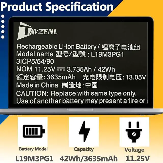 SpecificationsModel: L19M3PG1 Capatity: 47Wh/4125 Voltage:11.52V Battery type: Rechargeable Battery Color: Black 100% brand New from Manufacturer.