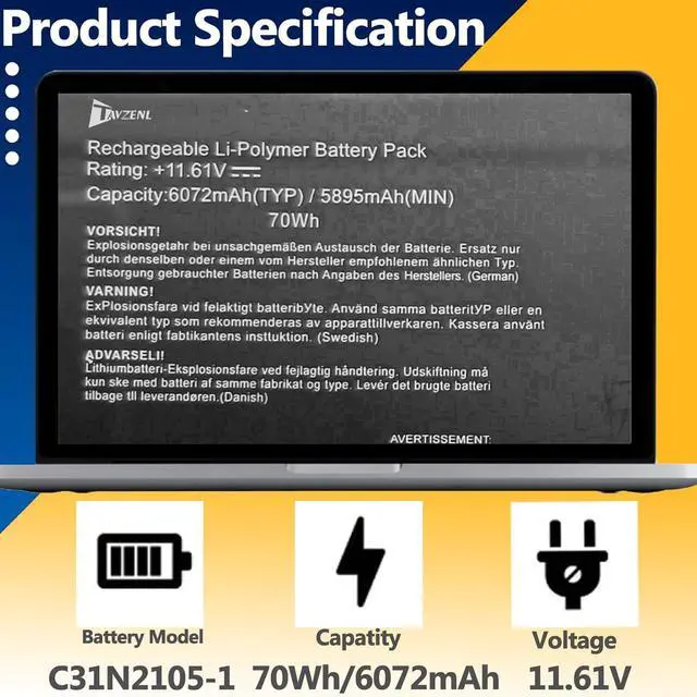 SpecificationsModel: C31N2105-1 Capatity: 70Wh/6072mAh Voltage:11.61V Battery type: Rechargeable Li-ion Battery Color: Black 100% brand New from Manufacturer.