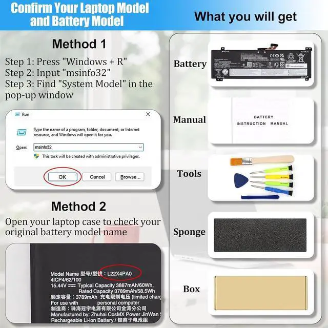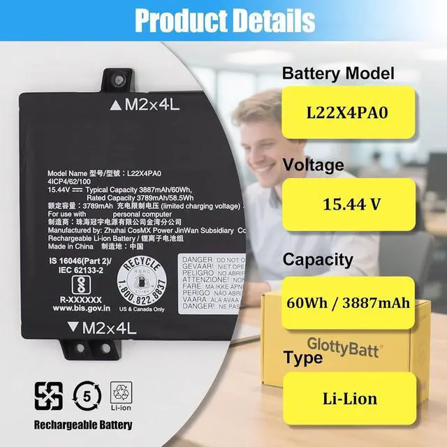 BATTERY SPECIFICATION: Model Name: L22X4PA0; Voltage: 15.44V; Capacity: 60Wh 3887mAh; Battery Type: Li-ion; Condition: 100% brand new from manufacturer; Package include: 1*battery + battery installation screwdrivers + 1*instruction for laptop battery