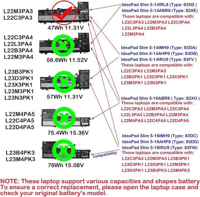 Compatible with Machine Models for Lenovo IdeaPad Slim 5-16IRU9 ( Type: 83FW ) Series. NOTE: This battery is only compatible with the IdeaPad Slim and is not compatible with the IdeaPad Flex or IdeaPad Pro. These laptops are compatible with batteries of various capacities (47Wh 56.6Wh 57Wh 75.4Wh 76Wh). To ensure you get the right battery, please open the back cover of your laptop and confirm that the battery you need matches the one in the picture before ordering.