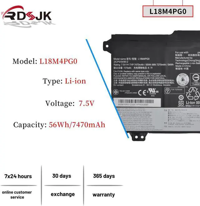 Battery type: Li-ion; Voltage: 7.5V; Capacity: 56Wh/7470mAh; Cells: 4-cell
