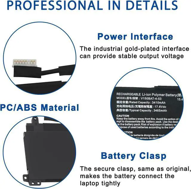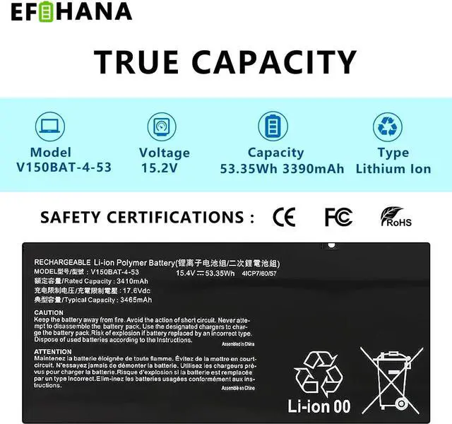 SpecificationsModel:V150BAT-4-53// Battery type: Li-ion // Voltage: 15.2V // Capacity: 53.35Wh/3390mAh // 100% New from Manufacturer. Top circuit boards and smart chip.