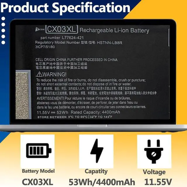 SpecificationsModel: CX03XL Capatity: 53Wh/4400 Voltage:11.55V Battery type: Rechargeable Battery Color: Black 100% brand New from Manufacturer.