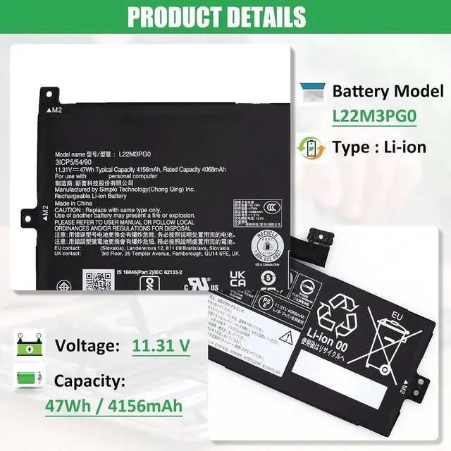 BATTERY SPECIFICATION: Model Name: Battery L22M3PG0; Voltage: 11.31V; Capacity: 47Wh / 4156mAh; Battery Type: Li-ion; Condition: 100% brand new from manufacturer; Color: Black; Packaged come with: 1*battery + battery installation screwdrivers + 1*instruction for laptop battery