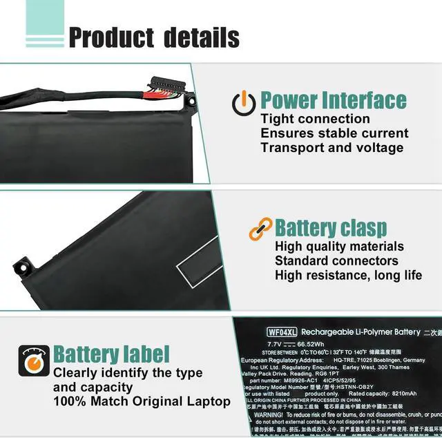 SpecificationsModel: WF04XL Rechargeable Battery, Voltage: 7.7V, Capacity: 66.52Wh/8210mAh,Type: Li-ion Battery. Package include: 1* WF04XL battery 1 set matching installation tools. 1*Instructions for WF04XL Battery. All our products up to 500 recharge cycles over the life of the battery.