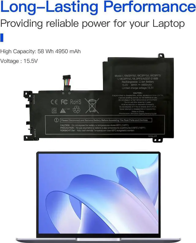 Battery Models: L19M3PF6; This battery features a full charge capacity of 58 Wh 4950 mAh, with a voltage of 11.55 V, providing reliable power for your Lenovo laptop