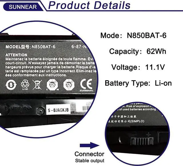 SpecificationsModel: N850BAT-6 Voltage: 11.1V Capacity: 62Wh/5500mAh Battery type: Li-ion.