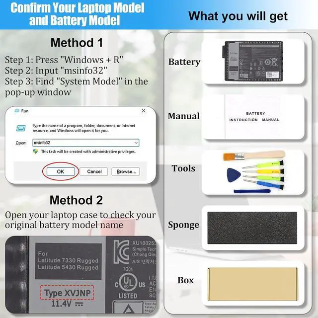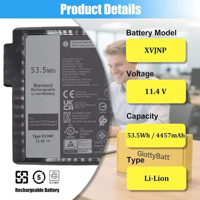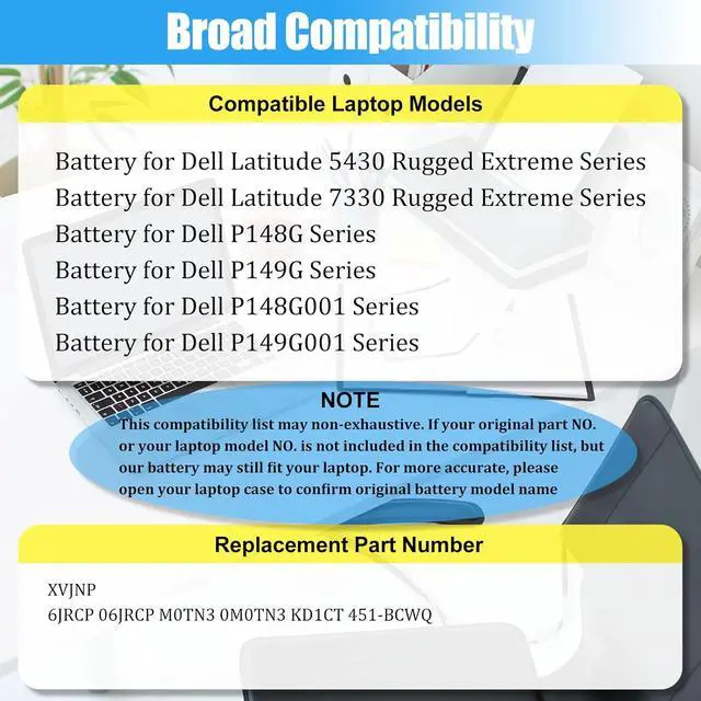 COMPATIBLE LAPTOP MODELS: This Laptop battery XVJNP replacement for Dell Latitude 5430 Rugged Extreme Series; For Dell Latitude 7330 Rugged Extreme Series; For Dell P148G Series; For Dell P149G Series; For Dell P148G001 Series; For Dell P149G001 Series