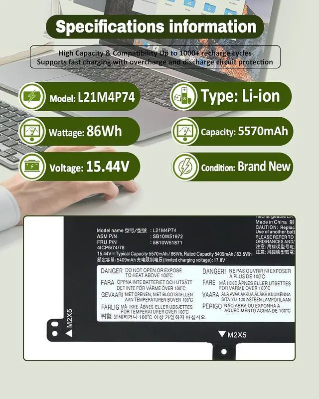 Battery SpecificationsVoltage:15.44V; Capacity: 86Wh ; Color: Black. More than 500 cycles. Package Contents: 1 × Replacement Battery + 1 × Detailed Instruction Manual + 1 × Professional Screwdriver Kit