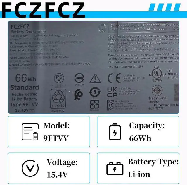 SpecificationsBattery Model: 9FTVV // Voltage:15.4V // Capacity:66Wh 4182mAh // Color:Black // Condition:Brand New.