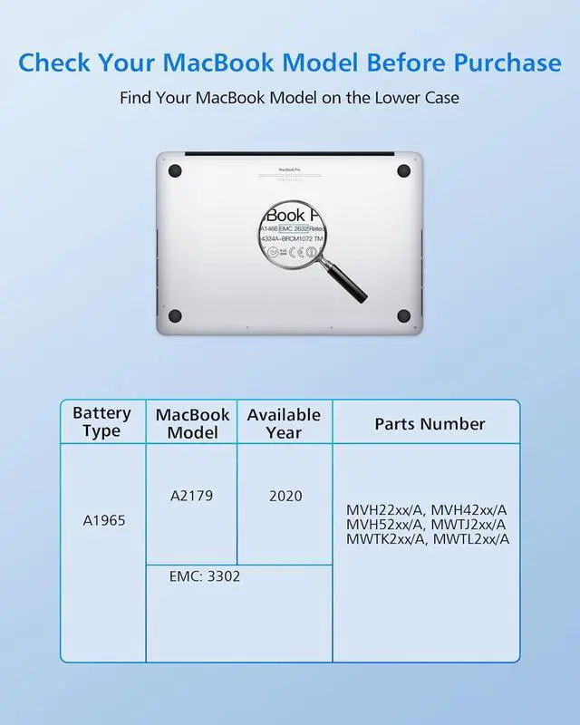 Perfect Compatibility: Specifically designed for MacBook Air 13-inch A2179 (2020) and compatible with battery model A1965. This battery fits perfectly and works seamlessly with your original charger and hardware