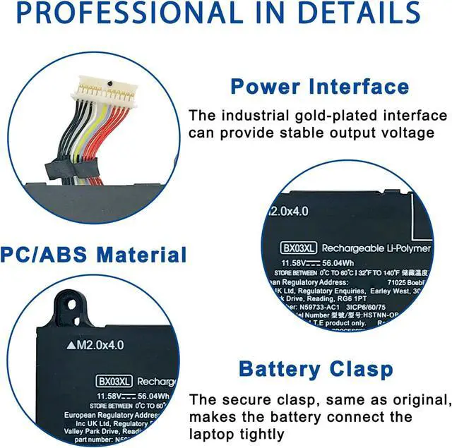 SpecificationsModel:BX03XL // Battery type: Li-ion // Voltage: 11.58V // Capacity: 56.04Wh/4646mAh // 100% New from Manufacturer. Top circuit boards and smart chip.