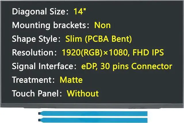 Diagonal Size14.0"; Mounting bracketsNon; Outline ShapeSlim (PCBA Bent); Resolution1920(RGB)×1080, FHD; Signal TypeeDP/30 pins Connector; TreatmentMatte; Touch PanelWithout;