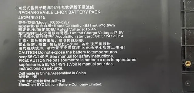Battery Type: Li-ion, Capacity: 15.4V; Voltage: 4583mAh 70.5Wh