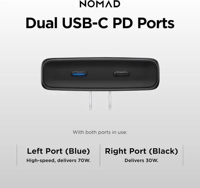 Charge More With Less: Power meets versatility with our Slim Wall Charger Adapter. With both ports in use, 70W of power from the high-speed left port fast charges an MacBook while 30W from the right port fast charges an iPhone.