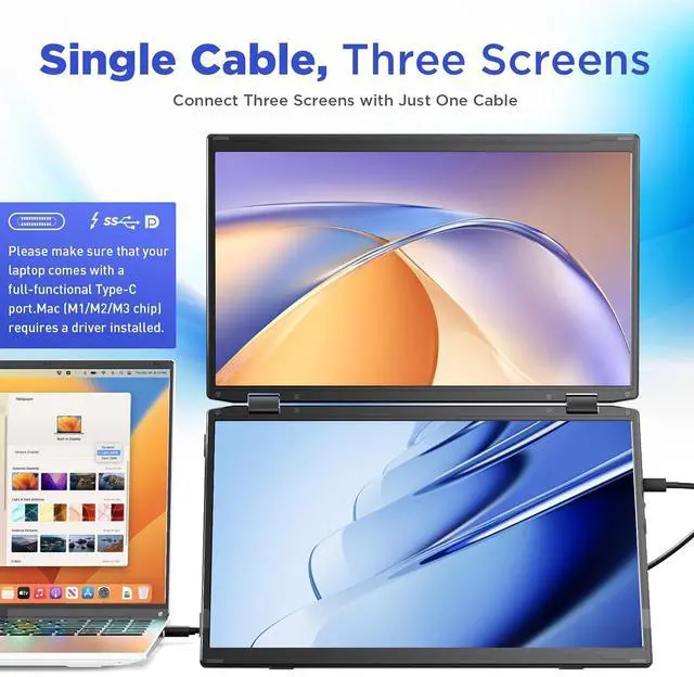 Single Cable, Triple Screens: Simply use a Type-C cable to connect your laptop to this Maxfree laptop screen extender to enjoy three powerful workstations, reducing complicated installation steps. Plug and play, no driver required. Note: If your laptop is Mac equipped with an M1/M2/M3 chip or doesn't have a full-featured Type-C port, please install the driver(If the driver is not installed on the Mac, one screen of the monitor extender will not display.)