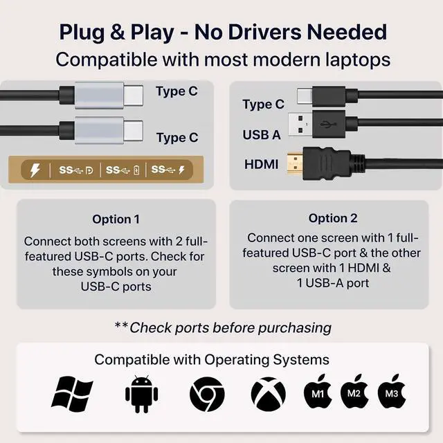 CHECK COMPATIBILITY BEFORE BUYING - To use the monitors without an external power source you need to check our images for which ports you need. If you use an older model laptop you might have to use an external power supply for the screens. Our included instructions and starter video guide will walk you through everything!