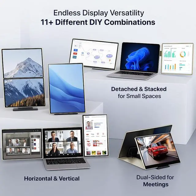 THE MOST VERSATILE DESIGN - Our dual screen monitor for laptop is the newest on the market. Allowing you to adjust, rotate & detach however you want. There are 11+ different combinations to display your screens to your liking. The instruction manual will show you all possible set-ups!