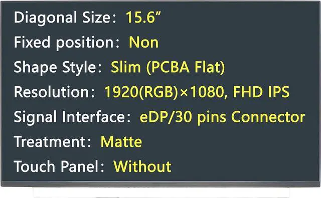 Diagonal Size15.6 Fixed positionNon Shape StyleSlim (PCBA Flat); Resolution1920(RGB)×1080, FHD IPS Signal InterfaceeDP/30 pins Connector TreatmentMatte Touch PanelWithout
