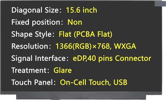 Diagonal Size15.6 inch Fixed positionNon Outline ShapeSlim (PCBA Flat); Resolution1366(RGB)×768, WXGA Signal TypeeDP , 40 pins Connector TreatmentGlare Touch PanelOn-Cell Touch, USB