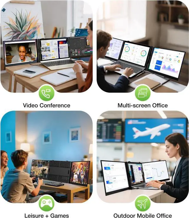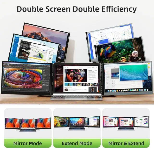 Double Screen Double EfficiencyThe laptop monitor extender attached to your laptop can get triple screens for usage. The laptop monitor extender supports extended, mirrored, duplicate, portrait, and landscape modes. It can perform multiple tasks at the same time, greatly improving efficiency (up to 300%), and is a rare productivity tool.The portable laptop monitor is perfectly used by office worker, stock trader, programmer, musician, entrepreneur, engineer, blogger, writer, student,etc.