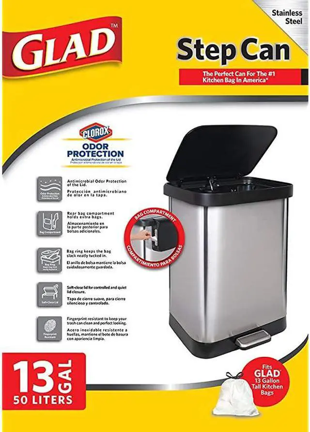 Style Name: Step Can Clorox odor protection stainless steel step trash can offers cloroxtm antimicrobial protection of the lid and lid frame by inhibiting growth of odor causing bacteria for the life of the can. bag compartment convenience Save time by storing extra bags at the rear bag compartment of your stainless steel step trash can. You can easily dispense the trash bags from the sides while the can stays in place. keeping that bag out of sightthe bag rings keep the trash bag secure and in place so you don't need to worry about showing excess trash bag out of your elegant trash can. garbage in, garbage out easy no need to worry about taking out bulky, large trash from the can. With stainless steel step trash can, The complete lid and frame hinge stay open while you take out the trash bag from the can. quiet mood enhancing step operation The stainless steel step trash can provides a convenient and quiet step operation with a controlled gentle closure. no fingerprints left fingerprint resistant so your can looks shiny and elegant all the time. Focus on more important things like enjoying quality time with your family or leaving a lasting good impression on your guests.