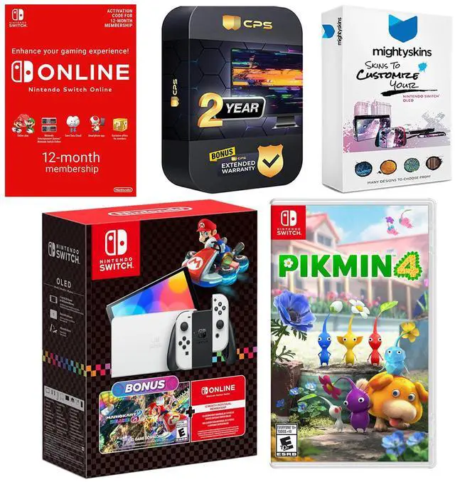 INCLUDED: Nintendo Switch OLED Console, Dock, Left & Right Joy-Cons, Joy-Con Wrist Straps, Joy-Con Grip, HDMI Cable, AC Adapter, MightySkins Voucher, Mario Kart 8 Deluxe game download, Pikmin 4 physical game, Nintendo Switch Online 12 Month Family Membership and 2 Year CPS Extended Warranty