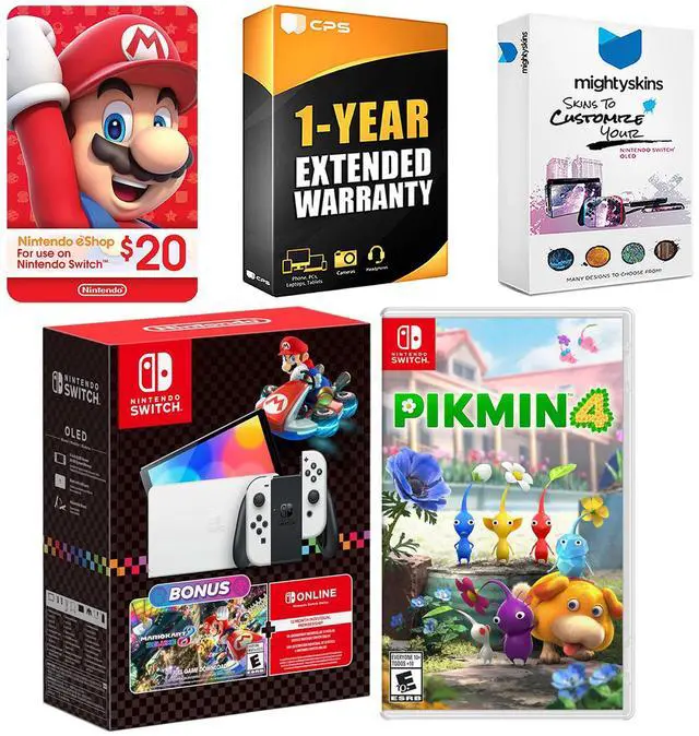 INCLUDED: Nintendo Switch OLED Console, Dock, Left & Right Joy-Cons, Joy-Con Wrist Straps, Joy-Con Grip, HDMI Cable, AC Adapter, MightySkins Voucher, Mario Kart 8 Deluxe game download, Pikmin 4 physical game, Nintendo $20 eShop Gift Physical Card and 1 Year CPS Extended Warranty