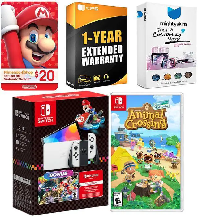 INCLUDED: Nintendo Switch OLED Console, Dock, Left & Right Joy-Cons, Joy-Con Wrist Straps, Joy-Con Grip, HDMI Cable, AC Adapter, MightySkins Voucher, Mario Kart 8 Deluxe game download, Animal Crossing physical game, Nintendo $20 eShop Gift Physical Card and 1 Year CPS Extended Warranty