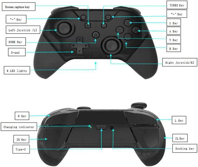 (5) Turbo function: hold down any key of ABXY, then press the ""Turbo"" key, and the corresponding key will open the repeat mode.Hold down the ""Turbo"" key of the controller, and perform the right 3D upward and downward operation at the same time, adjust the speed of continuous firing.
